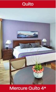 • Hotéis de primeira categoria em Quito/Guayaquil e categoria turística em Galápagos.